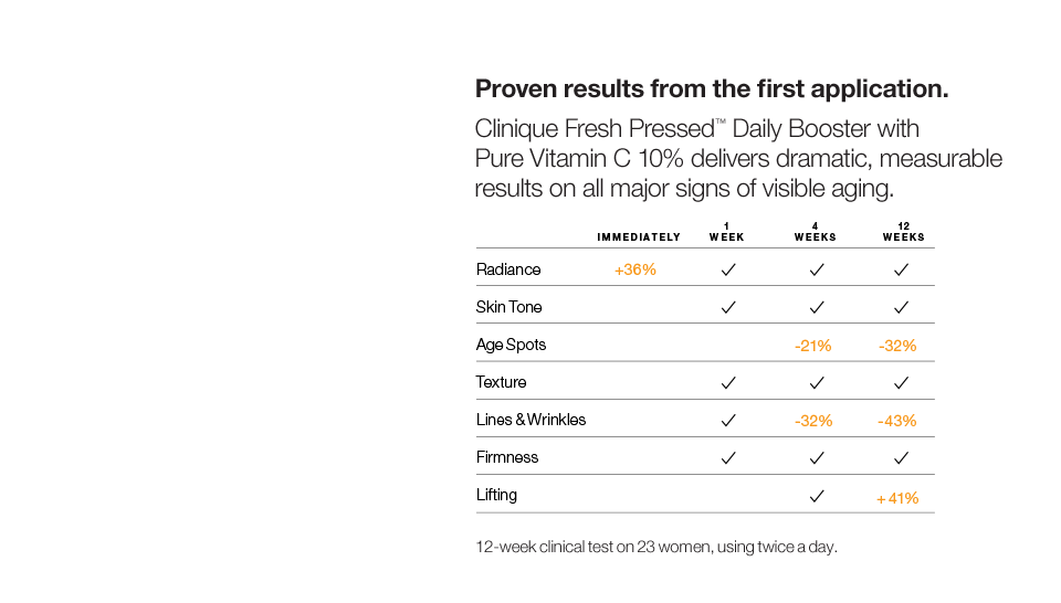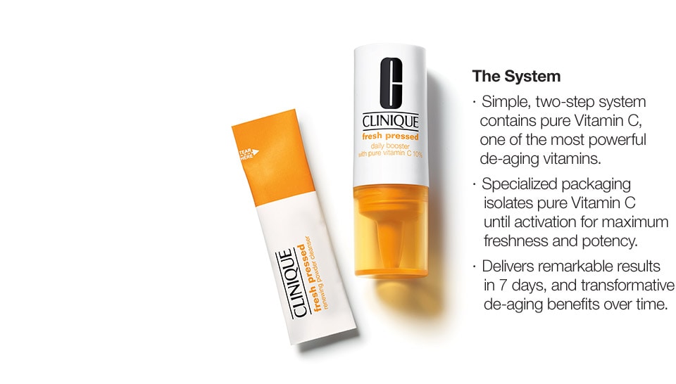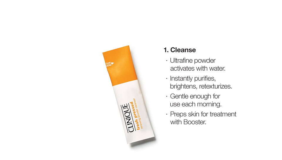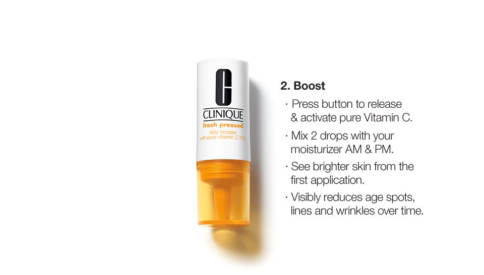 Mix in 2 drops of Clinique Fresh Pressed™ Daily Booster with Pure Vitamin C 10% to enjoy all your favorite benefits—plus a rejuvenating jolt of repair.